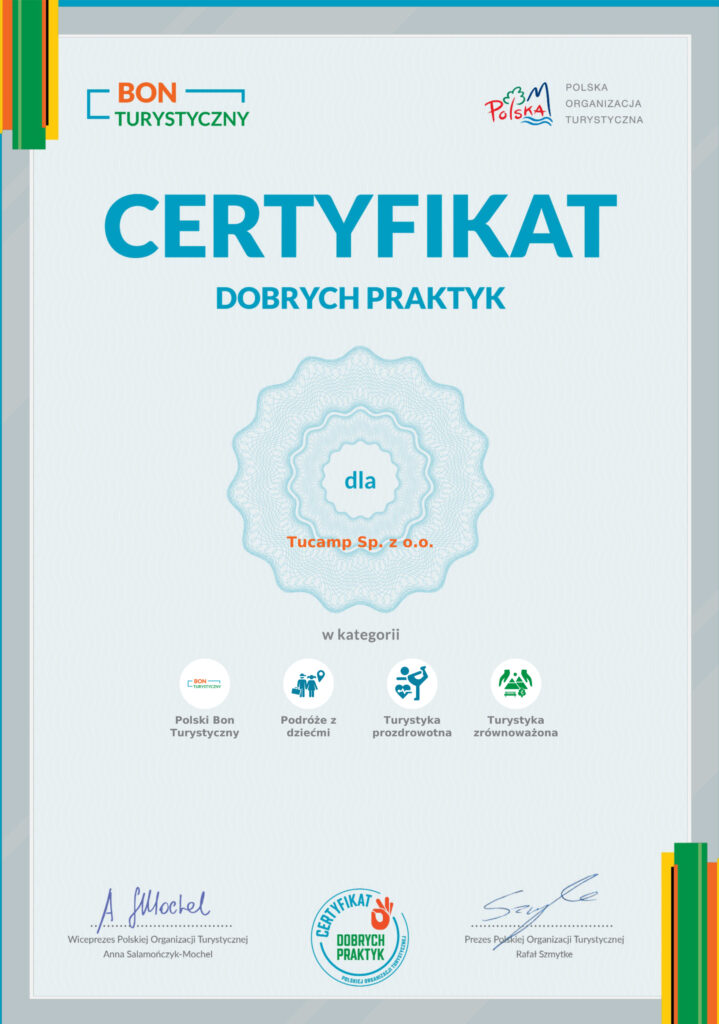 Jako licencjonowany organizator otrzymaliśmy “Certyfikat dobrych praktyk” wydany przez Polską Organizację Turystyczną. Realizujemy nasze wyjazdy i działania zgodnie z założeniami działów: