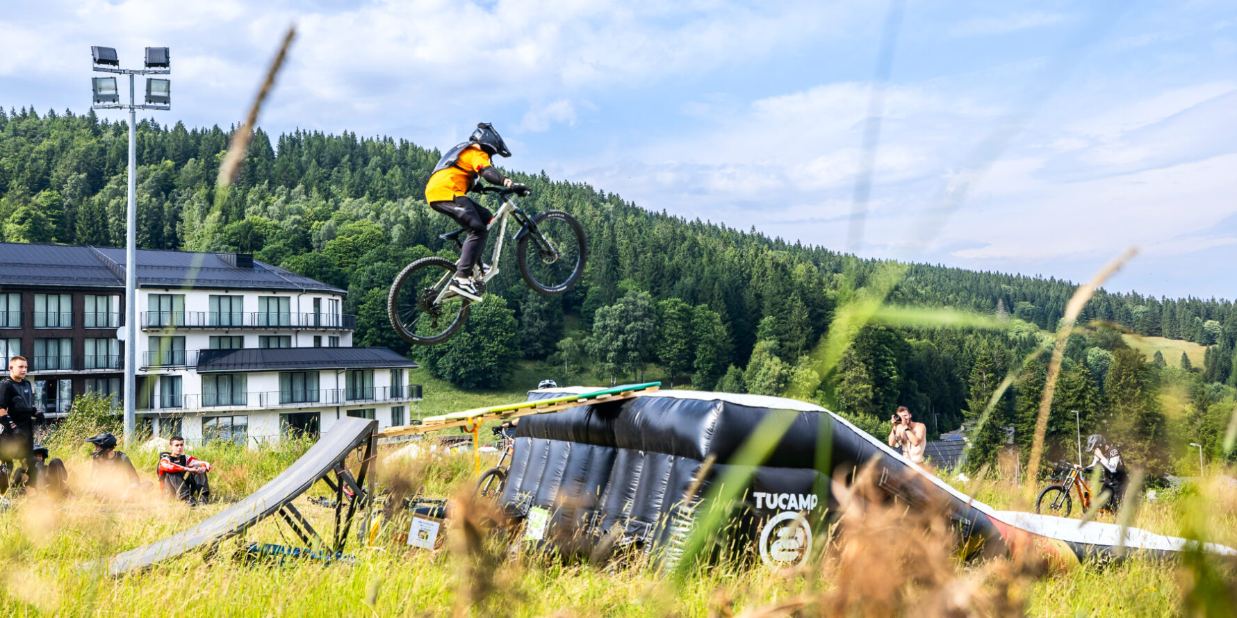 Aby wziąć udział w naszym obozie musisz już umieć jeździć na rowerze z dwoma kołami 😉 …a tak na poważnie, jest to wyjazd dla wszystkich, którzy kochają zjazdowe rowery górskie, chcą się uczyć lub doskonalić technikę jazdy w trudnym terenie i skakać oraz podziwiać piękne krajobrazy z perspektywy siodełka. Czarna Góra to kultowe miejsce dla polskiej sceny DH, dlatego nasze szkolenia skupią się na technice zjazdowej. Oczywiście elementy skoczne również występują!